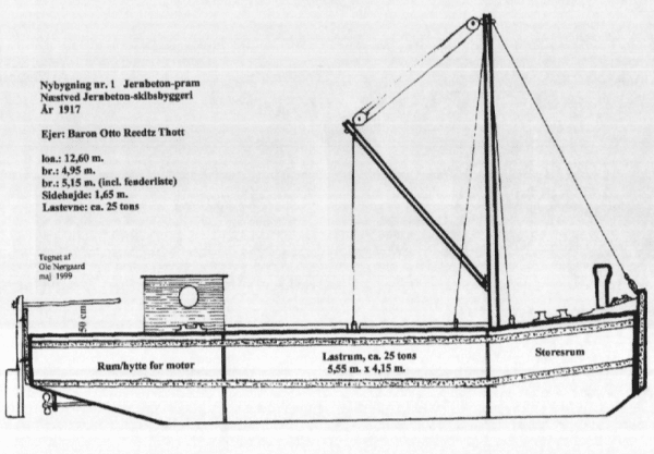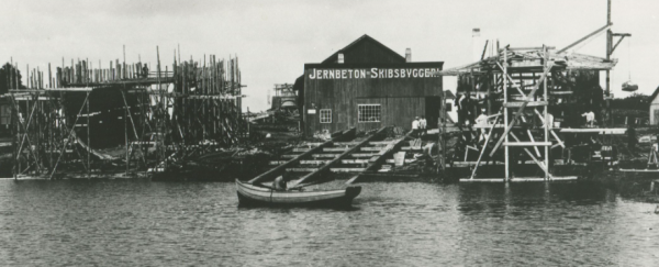 ”Pram nr. 1” skulle støbes i beton, og for at bygge prammen opføres skibsværft.