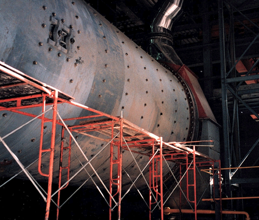 På foto er der billede af en kuglemølle der er beregnet til at male cement. En stor tromle fyldes med kugler og drejes så rundt med en motor.
