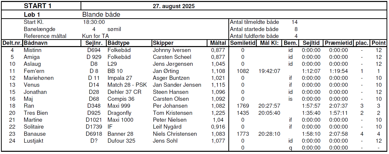 9 både kom til start og 8 startede, 4 fuldførte ikke sejladsen og 4 gennemførte.